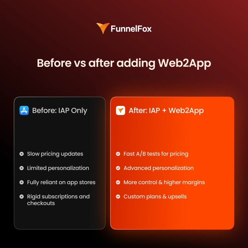 Web2app doesn’t replace IAPs—it complements them. Apps keep IAPs for what they do well and layer web2app on top to unlock flexibility.