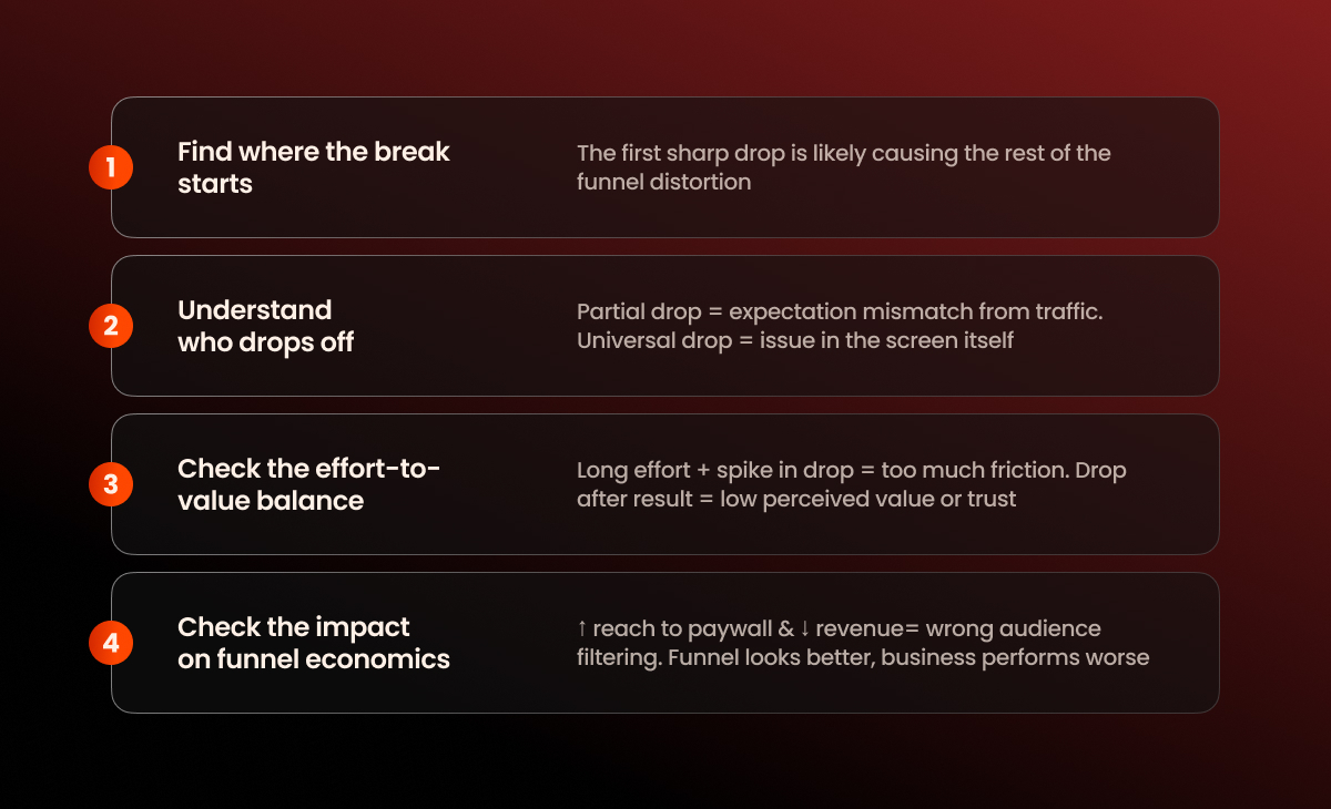 Drop-off per step — evaluates the same step in isolation and checks consistency. If the drop repeats across segments and time, the step itself is the problem. If it fluctuates, it’s likely noise or traffic quality.